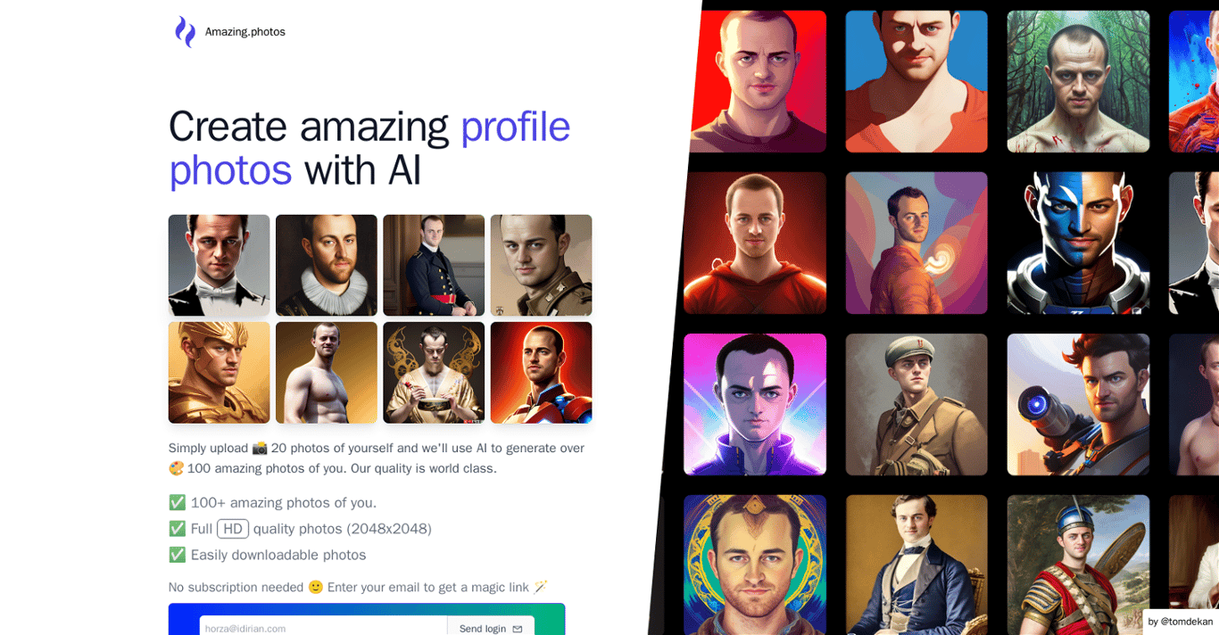 Create your own AI-generated profile picture with Amazing.photos, getting 1,000+ high-quality images while keeping full control over your data.
