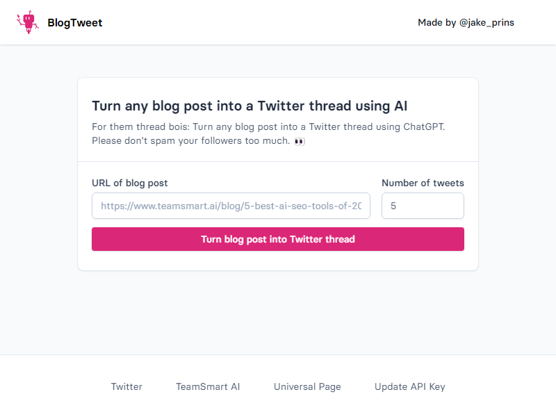 A social media automation tool that transforms blog posts into curated Twitter threads using AI technology, while offering customization options for tone, imagery, and audience targeting.