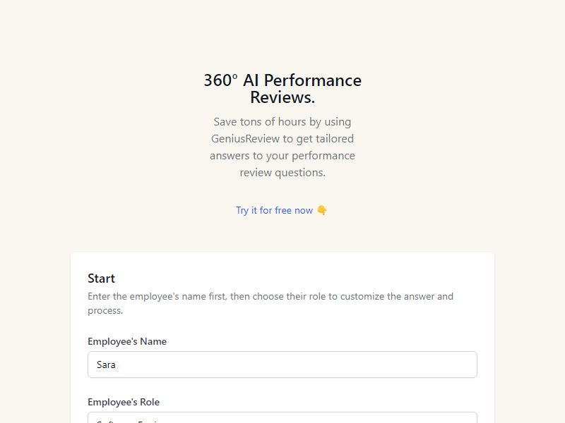 GeniusReview transforms traditional performance reviews with AI-powered customization. Through role-specific skill assessments and structured feedback prompts, managers provide detailed, evidence-based evaluations.