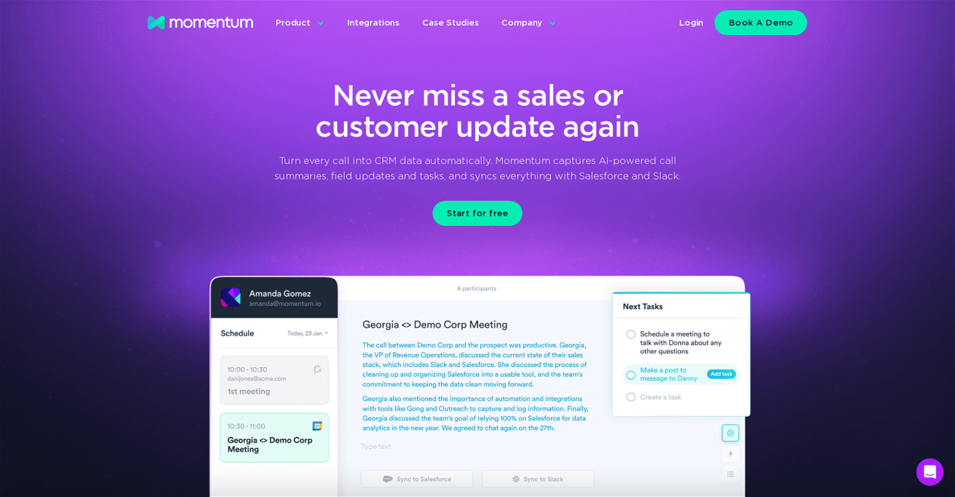 Momentum revolutionizes revenue operations with AI-powered sales tools that automate call summarization and CRM integration, reducing note-taking time by 30% while enabling 400% growth in some customers' sales cycles.