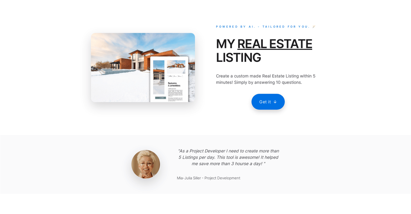 AI-powered real estate listing platform generates customized property brochures through automated content creation while offering both Basic and Pro subscription tiers with scalable listing limits.