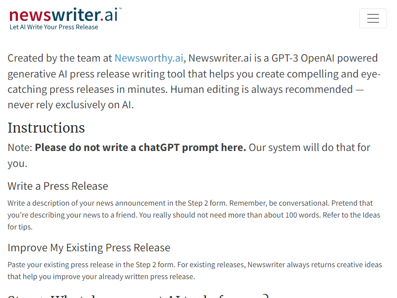 Newswriter.ai combines AI and human oversight to create compelling press releases quickly. The platform uses GPT-3 technology to generate concise, engaging content while giving journalists full control over the final product.