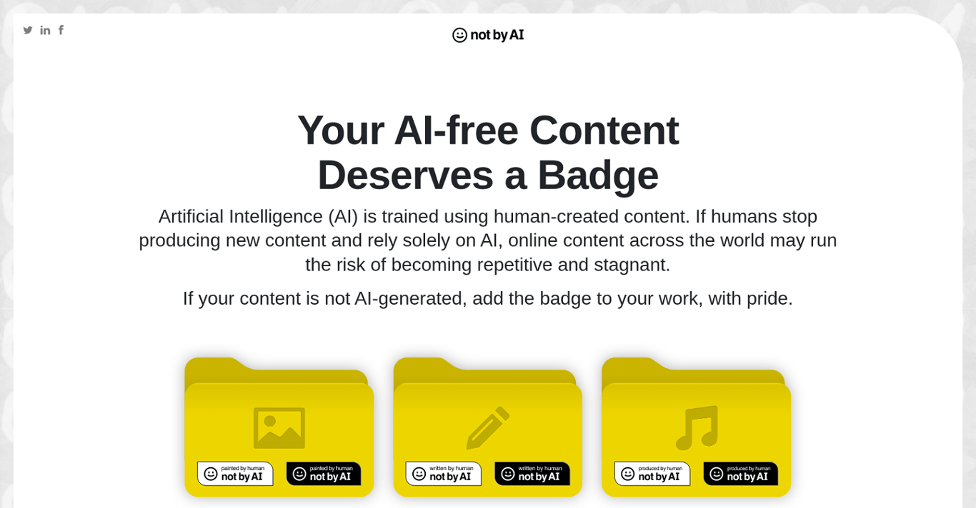 Not by AI establishes rigorous human-centric content creation standards through a comprehensive badge system, ensuring at least 90% of content meets its human-generated criteria while preventing the replacement of original content with AI material.