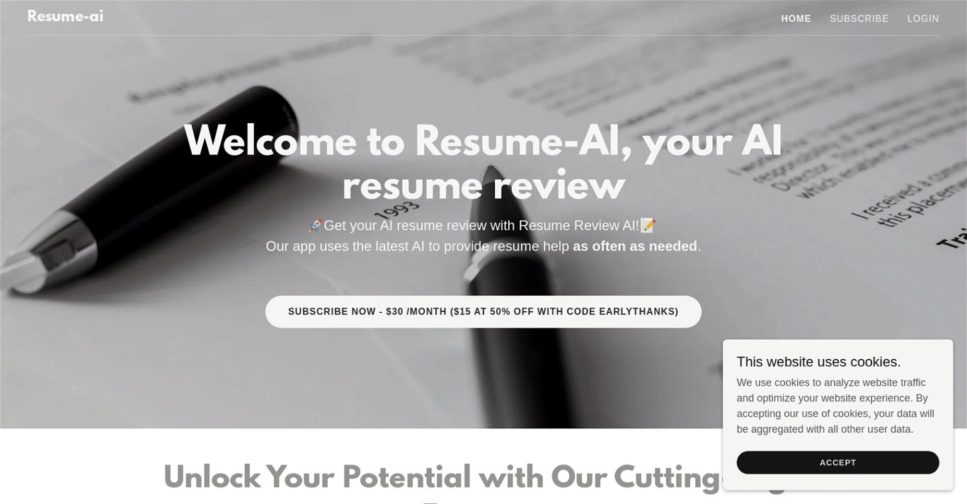 Resume AI by Toyiyo, LLC, uses AI to optimize your resume for ATS systems, craft compelling cover letters, and prepare you for interviews, with subscription plans starting at $30 per month.