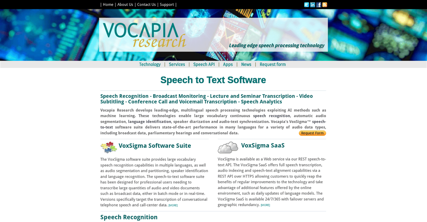 Multilingual speech-to-text platform VoxSigma enables accurate transcription across 30+ languages through advanced statistical modeling, with deployment options including on-premise software and cloud-based services.